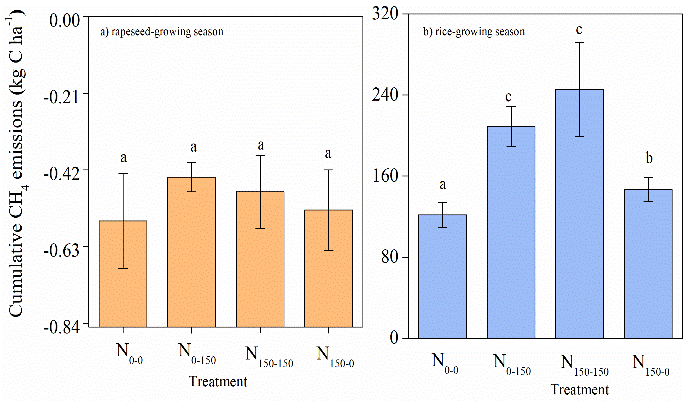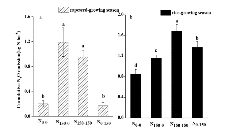 小区试验以油菜-水稻轮作系统为研究对象,设置了油菜和水稻生长季均施氮肥(N150-150);油菜季施氮肥,水稻季不施氮肥(N150-0);油菜季不施氮肥,水稻季施氮肥(N0-150);油菜和水稻季均不施氮肥(N0-0)。研究结果表明油菜季施氮肥不仅增加了油菜季N2O的排放总量,也增加了水稻季CH4和N2O的排放总量。这是因为油菜季施用氮肥促进了土壤碳的积累,这些碳在水稻季成为CH4产生的底物和N2O生成的能源物质。油菜季施氮肥还提高了水稻季土壤中铵态氮含量,高浓度的铵态氮可抑制稻田土壤CH4氧化从而增加其排放,同时,高浓度的铵态氮有利于土壤氨氧化过程的进行,增加其中间产物N2O的排放。