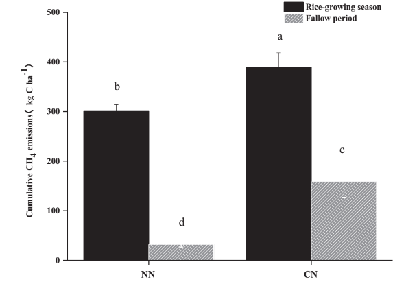 田间试验以典型冬水田为研究对象,即夏季种植水稻,冬季休闲的种植模式,设置水稻季常规施氮肥(CN)和不施氮肥(NN)两个处理。研究结果表明水稻种植期间施加氮肥不仅增加了水稻季CH4的排放,也促进了休闲期间土壤CH4的排放。