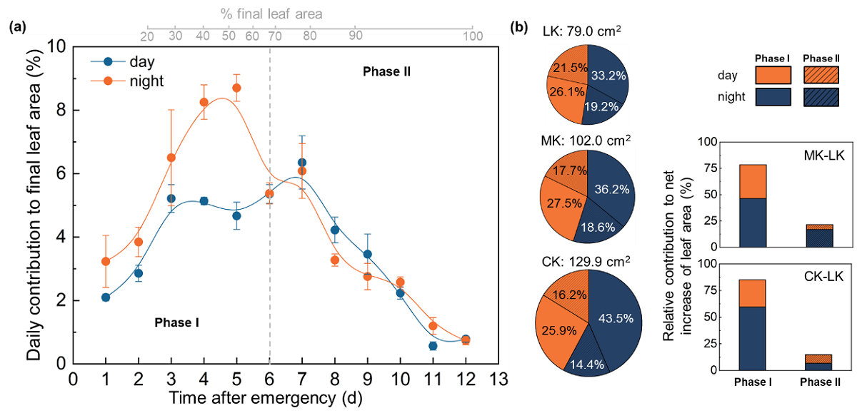 Carbon and water are two main factors limiting leaf expansion. Restriction of leaf growth by low availability of carbon or water is among the earliest visible effects of potassium (K) deficiency. It is not known how K is involved in regulating the rhythmic supply of these two substrates, which differ remarkably across the day–night cycle, affecting leaf expansion. We investigated the effects of different K regimes on the time courses of leaf expansion, carbon assimilation, carbohydrates, and hydraulic properties of Brassica napus. Potassium supply increased leaf area, predominantly by promoting night-time leaf expansion (>60%), which was mainly associated with increased availability of carbohydrates from photosynthetic carbon fixation and import from old leaves rather than improvement of leaf hydraulics. However, sufficient K improved leaf hydraulic conductance to balance diurnal evaporative water loss and increase the osmotic contribution of water-soluble carbohydrates, thereby maintaining leaf turgor and increasing the daytime expansion rate. The results also indicated an ontogenetic role of K in modifying the amplitude of circadian expansion; almost 80% of the increase in leaf area occurred before the area reached 66.9% of the mature size. Our data provide mechanistic insight into K-mediated diel coordination of rhythmic carbon supply and water balance in leaf expansion.