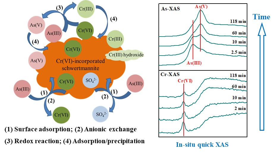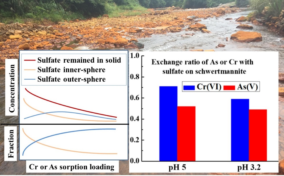 施氏矿物与砷(As)/铬(Cr)常共存于AMD等环境中,并对As/Cr有极强的吸附和富集能力,然而它们的相互作用行为与分子机制仍缺少深入认识。团队利用批量吸附-氧化实验和原位快速X射线吸收光谱(XAS),证实了Cr(VI)的嵌入可显著增强施氏矿物对As(III)的去除和氧化,进而降低Cr(VI)和As(III)的毒性和迁移性。具体的反应途径和机理包括As(III)表面吸附,阴离子交换,Cr(VI)和As(III)在矿物表面直接氧化还原,以及新生的As(V)和Cr(III)共吸附或沉淀(图3)。此外,从分子尺度对比研究了Cr(VI)和As(V)在施氏矿物表面的吸附行为和相关机制(图4)。结果表明,在单位吸附量条件下,Cr(VI)可交换结构中更多比例的硫酸根和更少>Fe-OH/OH2官能团,形成双齿双核内圈络合物;而As(V)则交换比例相当的硫酸根和>Fe-OH/OH2官能团,且在高As、低pH下形成无定形FeAsO4表面沉淀。该研究还证实,虽然Cr(VI)和As(V)能同时交换硫酸根内圈配位和外圈配位,但总体上优先交换硫酸根内圈配位。上述研究结果对深入理解不同环境地球化学条件下施氏矿物的形成、结构稳定性和界面反应性具有重要意义,并为预测和评估相关环境中As和Cr的形态和生态环境风险提供了科学依据。