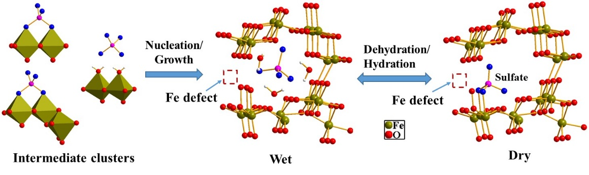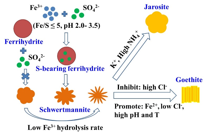 施氏矿物是一种富含硫酸根的水合羟基铁氧化物,结晶度弱、比表面积大,常见于酸性矿山废水(AMD)和酸性硫酸盐土壤等环境及其周边区域,控制和影响着该环境中各种重金属污染物(尤其是含氧阴离子)的形态、迁移和归趋。其中,硫酸根的含量和形态是影响施氏矿物结构稳定性和表面反应性的关键因素。本团队首次通过硫(S)的近边与扩展边XAS,解析了矿物结构中SO42-的形态及其随环境条件的演化,表明在干湿变化过程中,结构SO42-由外圈配位向双齿双核内圈配位转化,且这种转化是可逆的(图1)。不同地球化学条件下施氏矿物的形成-演化模拟实验表明,除Fe2+氧化外,Fe3+直接水解也是其在环境中形成的重要途径,且颗粒内部嵌入有SO42-的水铁矿是该过程的中间相。在施氏矿物转化过程中,高温、高pH和共存的Fe2+均加速其向针铁矿转化,而低Fe3+水解速率和高Cl-浓度则抑制该转化;K+或高浓度NH4+则有利于诱导其向黄钾铁钒转化(图2)。