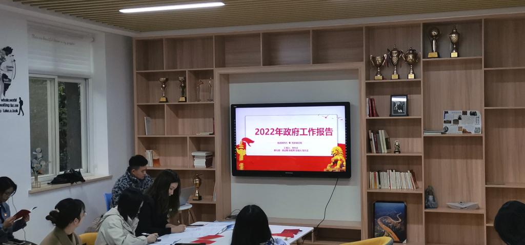 入党积极分子胡方正做了2022年政府工作报告学习分享,他从2021年工作回顾、2022年经济社会发展总体要求和政策取向以及2022年政府工作任务三个方面介绍报告主要内容。胡方正详细介绍了报告提到的文化方面的政策,并通过当今高校的发展模式由外延式转向内涵式的例子阐述了提供优质文化教育、培养专业人才的重要性。