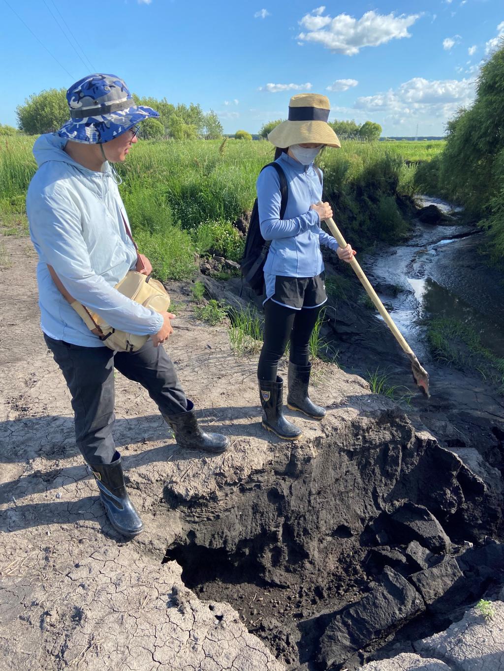 7月22日,实践团在海伦市周边开展实地调查和走访工作,支部指导教师王军光副教授、魏玉杰副教授等参加活动。在野外调查中,团队成员刘政感叹道:“虽然地表植被覆盖度较好,但我们依然能看见明显的水土流失现象。宽大的侵蚀沟不仅破坏了土地,减少耕地面积;同时土壤表层养分也在快速流失,浑浊的径流也能很好体现这里土地退化问题,总之我们的科研任务依然很艰巨”。