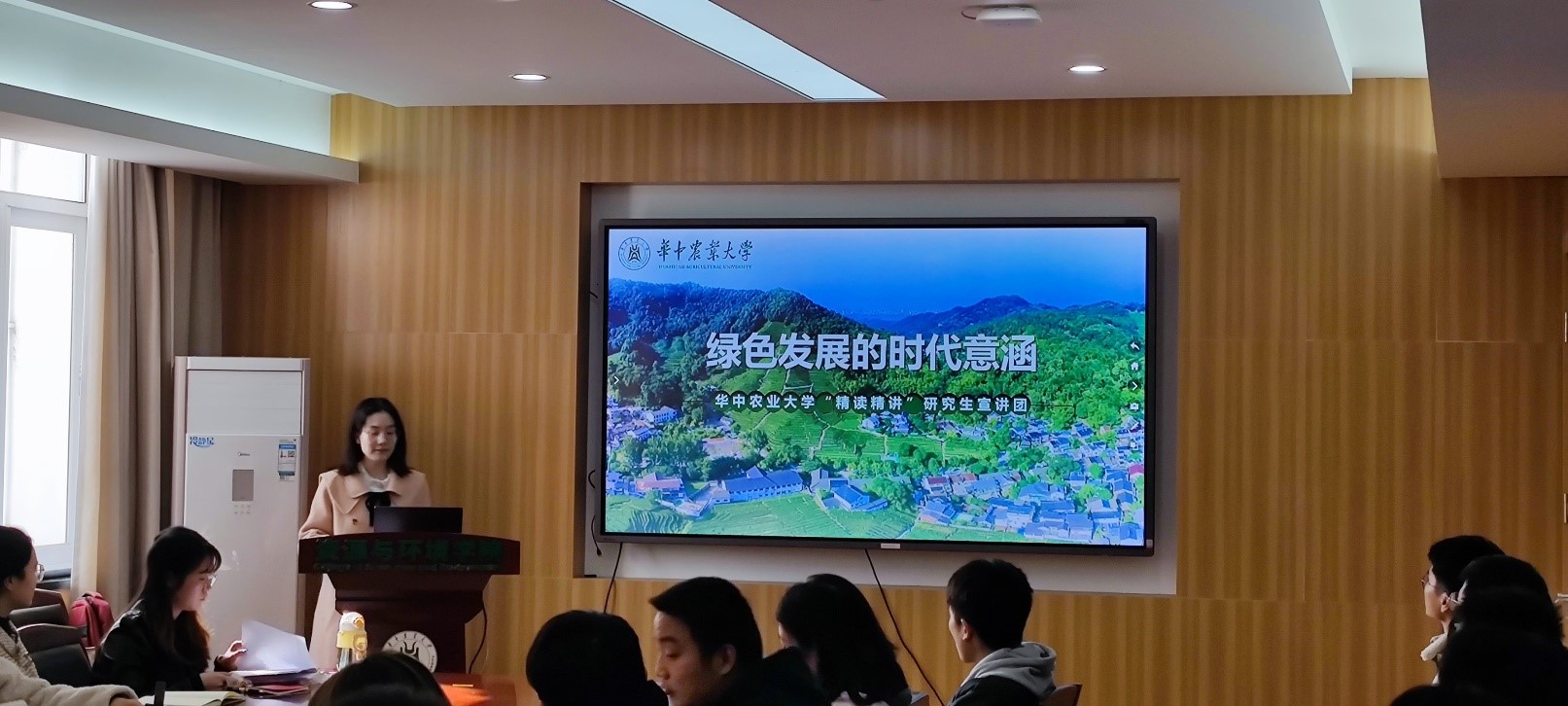 (通讯员:赵睿怡)11月25日下午,学校“精读精讲”研究生宣讲团在主楼315会议室开展“绿色发展的时代意涵”专题宣讲,宣讲团成员、食品科学技术学院2022级研究生刘卓担任主讲。学院研究生辅导员胡志宏,资源环境信息工程研究生党支部50余名同学参加学习。