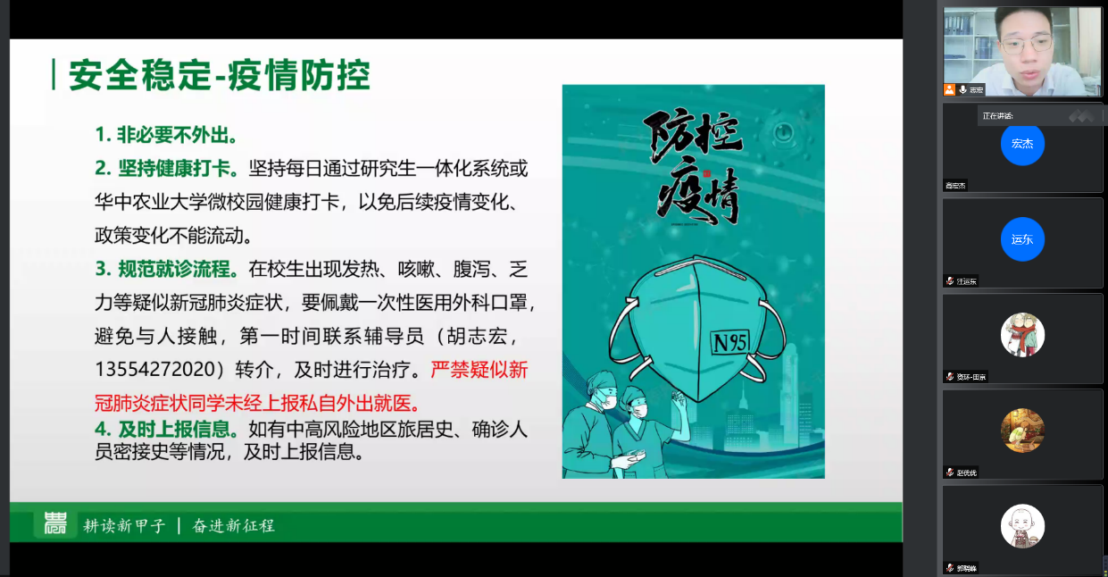 胡志宏老师从管理人员、管理架构、疫情防控、规则纪律、奖助工作等方面介绍了研究生日常教育管理的内容。新阶段、新精彩,他期待同学们学会在独立自主中激扬青春、成就自我。