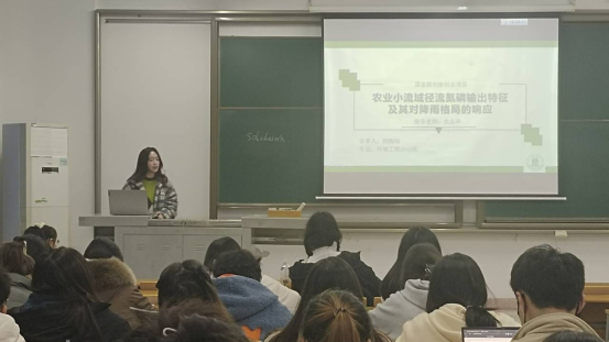 随后,环工2002班赵婉怡从《农业小流域径流氮磷输出特征及其对降雨格局的响应》项目出发,介绍了项目申报流程、实验过程、前期准备、与指导老师的沟通交流等,全方位阐述了如何在系统上进行申报,并分享了国创的答辩经验,最后以她个人的实验心路历程结尾,告诉同学们科研的目标在于提升自我和发现科研实践的乐趣。