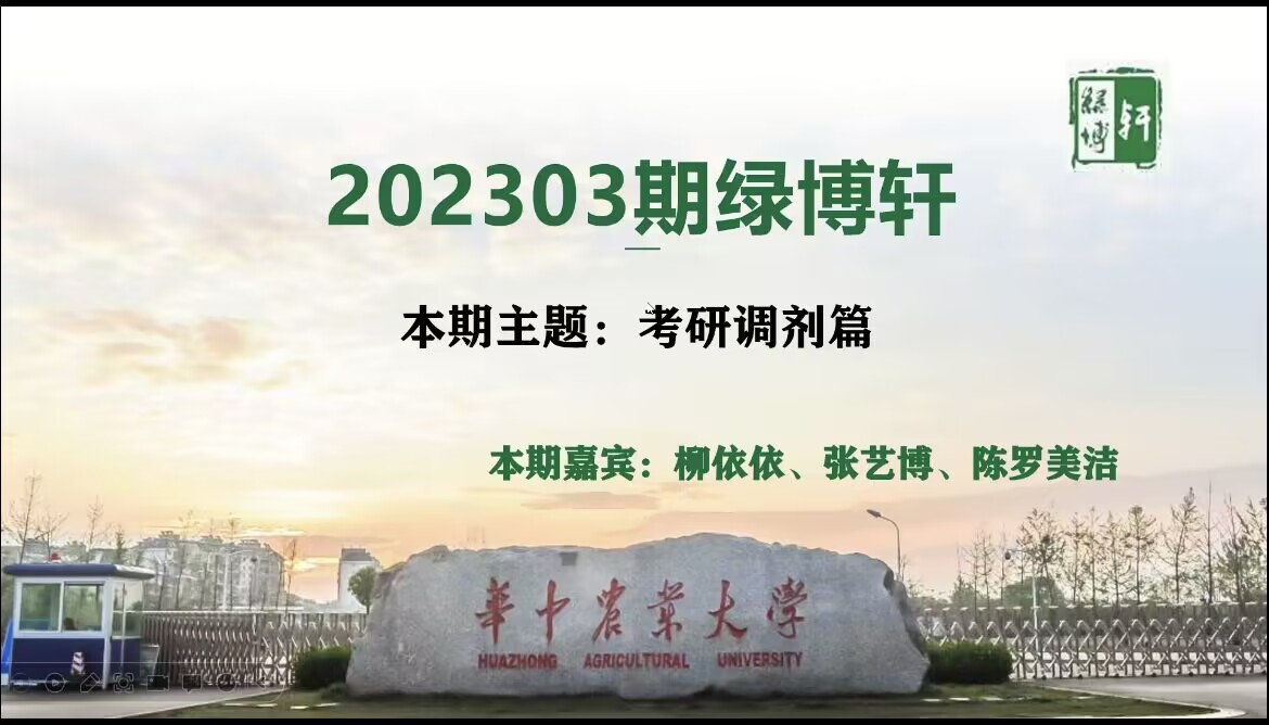 3月4日晚七点,为了帮助同学们对于考研调剂流程有更进一步的了解,我院以“考研调剂”为主题,于线上开启了202303期绿博轩。会上邀请到来自18级的柳依依、张艺博、陈罗美洁三位现已在各大高校读研的学姐为大家分享各自关于考研调剂的经验。