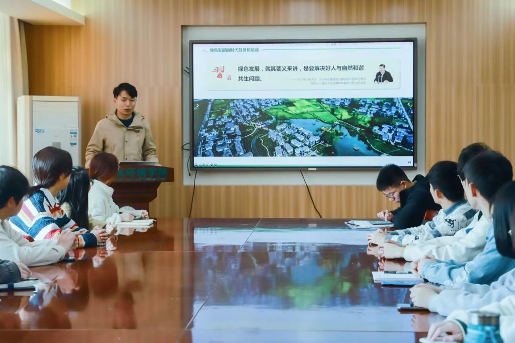 “绿色发展的时代意涵,在大学生的成长之路上如何体现?”学校党的二十大精神“精读精讲”宣讲团成员甄诚谈到,习近平总书记在党的二十大报告中指出,持续深入打好蓝天、碧水、净土保卫战,在这场战斗中,我们要深刻认识保护生态环境、实现绿色发展的重大意义,勇做“排头兵”、“主力军”。他介绍了买球赛的app官网在湿地保护、水污染治理、土壤有害物治理等方面取得的成果,随后,分享了学校2013届硕士毕业生张慧敏的故事,曾获“全国五一劳动奖章”的她矢志不负“环保人”的光荣使命,于2013年进入江西省生态环境监测中心工作,在当地发生水污染事件时,用专业知识实现污染最小化,长期奋战在环境监测的第一线。环工类2203班团支书江庆在学习后感慨道:“在青年榜样的引领下,我们更应树立远大理想,锤炼本领,接过为生态环境保护的接力棒!”