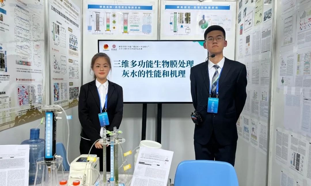 学院王紫琪、余子轩等同学的作品《三维多功能生物膜处理灰水的性能和机理》针对当下传统灰水处理过程中面临的一系列问题,开发了活性炭生物膜系统和菌藻生物膜系统。两大系统全程无需曝气供氧,分别在自流供氧和自产氧气的条件下实现了碳氮去除与碳氮固定,从而实现灰水的高效低能耗处理与资源化利用,达到开源、降耗、减污、降碳的目的。该团队项目由学院周云老师指导,目前该作品团队已发表2篇SCI论文,该作品荣获湖北省特等奖。