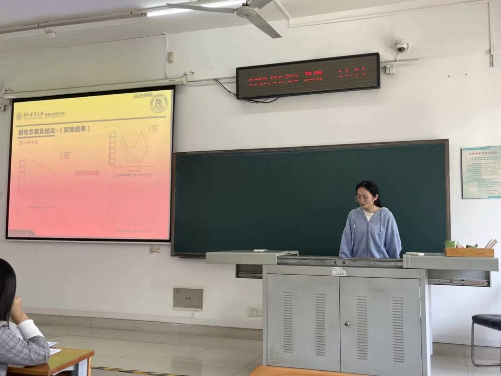 《基于改性树脂的除磷材料研发及其设备化应用》是环工1901班白羽菲所在团队的研究课题。实验利用了流化床吸附原理,开发了可填充吸附剂材料的箱体式离子交换设备,并在先前研究基础上探索了设备运行的参数优化试验以及污水处理厂二段出水的深度处理试验,研究结果为污水厂出水磷浓度消减和磷资源回收利用提供了技术支撑。汇报时白羽菲也提到了此项目所参加比赛拿到的奖项,老师们对项目内容进行了提问,最终给予肯定。
