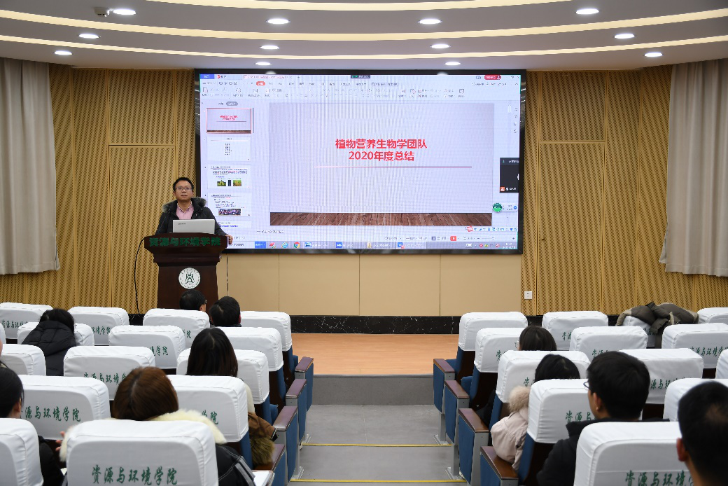1月10日,资源与环境学院植物营养生物学课题组2020年度学术年会在西附楼报告厅举行,徐芳森教授、石磊教授、王创教授、蔡红梅副教授、丁广大副教授和汪社亮副教授出席了会议,课题组全体同学参会。