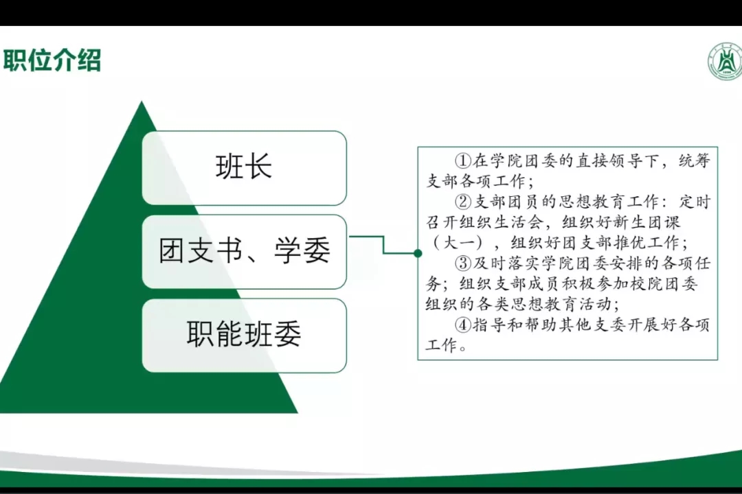 刘熠君介绍了团委和党建办公室的各个部门。她首先从自己的大学生活开始谈起,将自己的大学生活分为学习方面、学生工作和课余生活三个部分,介绍了自己在工作上的所思所想所获,引起了新生同学们对学生工作的兴趣。