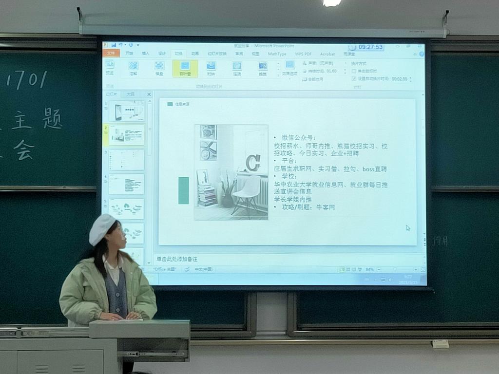 经验分享环节分为求职经验分享和升学经验分享。本次班会特别邀请了地信1703班的叶璐晨同学进行了求职经验分享,叶璐晨同学根据自己的求职经历,梳理了求职的具体流程,并从自我认识、信息收集、简历制作、能力提升、面试等多个方面详细分享了她的求职经验。她提到,求职路上一定要学会如何展现自我自信是求职不可缺少的一环,要把自己的才华和独特的风采展现给别人看。